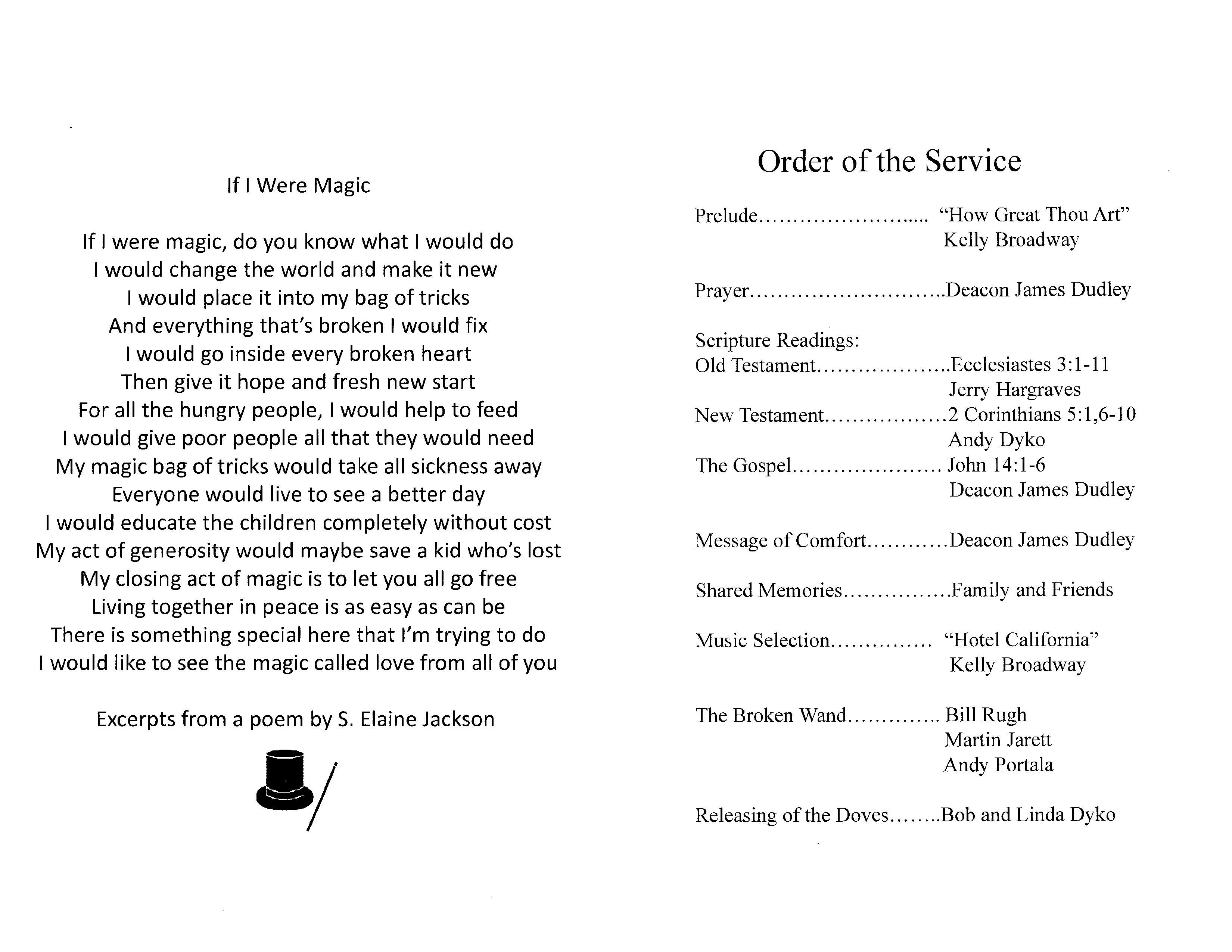 Visitation will be from 2 to 8 p.m. Friday in Sujkowski Funeral Home Northpointe where a memorial service, including a Broken Wand ceremony for magicians, will be at 11 a.m. Saturday.